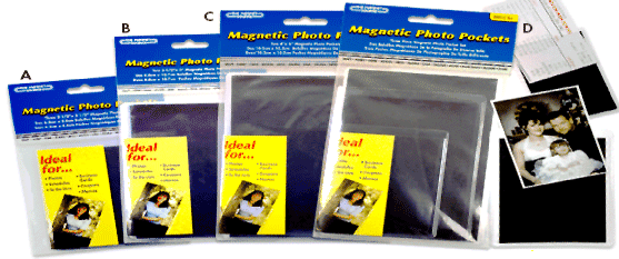 Magnetic photo pockets are clear, non-acidic plastic sleeves with magnet backing. Great for photos, schedules and memos. Ideal for school, home and office supply stores.