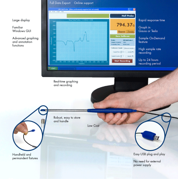 Key Features Advanced Display Features - standard numeric digital display and advanced real-time graphical display modes for both Tesla (T) and Gauss (G) scale measurements. Graph visualisation mode supports identification of key points in field such as peak fields. Also supports visual annotation and cursor analysis of key data points, measurement timestamping and field polarity indication. High Sample Rate - supports unique measurement possibilities, such as dynamic measurements over time (up to 24 hours recording possible), static measurements of different field points in magnetic assemblies, as well as standard one-off measurements. Measurement scenarios are supported by continous and manual sampling modes. Low cost - No need for expensive gaussmeter/teslameter/voltmeter hardware to measure fields - replaced by easy-to-use USB software toolkit interface. Flexible Measurement Probe Handle - can be used as a handheld device or as a clamped permanent fixture, supporting most measurement configurations possible with standard transverse and axial probes. The probe is attached to a 2.5m flexible cable, assisting hard to reach measurement areas. Advanced Data Support - supports exporting and archiving of numeric data and graphs in all key standard formats, including Microsoft Excel (CSV, XLS), HTML, JPG and PNG formats. No Batteries Required - all power comes from PC via USB port |