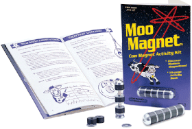 This kit includes a special cow magnet and an illustrated activity book. The magnet is a special version of an actual cow magnet, which is used to prevent "Hardware Disease" in cows. The cow magnet disassembles into 16 pieces (including five powerful ceramic ring magnets) for use with activities in the 16-page booklet that can be used as a lesson plan. The booklet features "Bessie Bovine" who guides youngsters through 12 exercises that teach them the principles of modern magnetism. Ages 6 and up.