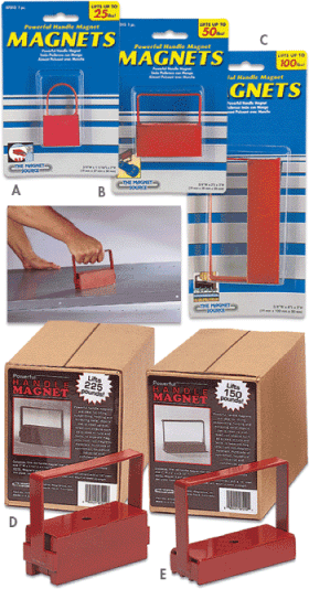 Handle magnets clean up scattered iron objects, including screws, nuts and bolts. Can be used to lift heavy metal objects, such as shelving, beams and doors. These handle magnets lift up to 100 times their own weight! |