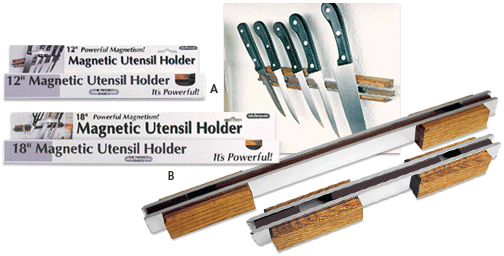Magnetic Knife and Utensil Holders Magnetic knife and utensil holders hold, display and organize knives, utensils and cooking tools with 20 lbs. of pull per inch. Perfect for any kitchen, bar or recreational vehicle. Each features a non-rust, magnetic assembly in a stained wood channel with two mounting screws included. |