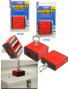 Add the enclosed eye hook on the top or side of the magnet and use to hold, Lift and hang objects. Each has two powerful ceramic magnets encased in bright red plastic casing with black rubber sides. Includes two Magnetic Shields to block magnetic strength when magnet is not in use. The shields allow easy storage in a toolbox without attracting other tools. Hundreds of uses are possible!